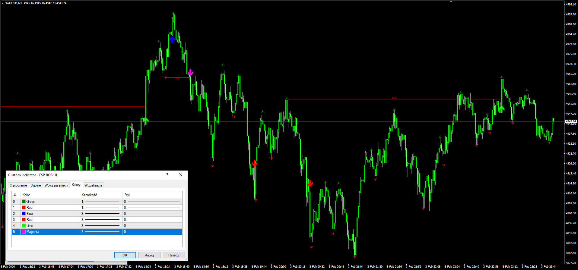 Wskaźnik FSP BOS HL jest podobny do FSP BOS MA, tylko swingi budują się na podstawie zasady Higher high / Lower low .