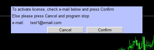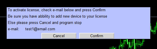 Якщо на цьому комп’ютері в цьому Metatrader вже було виконано логування і було встановлено прапорець «Select if you want program remember», ця панель буде пропущена і відразу з’явиться панель активації, як на зображенні нижче. Якщо це перше логування або під час попереднього логування прапорець «Select if you want program remember» не було встановлено, потрібно ввести електронну пошту та пароль, з якими Користувач був зареєстрований у Базі Даних, і натиснути кнопку «Confirm». Тоді панель логування заміниться на панель активації. Якщо це перша активація ліцензії цієї програми для Користувача, панель активації виглядатиме наступним чином: