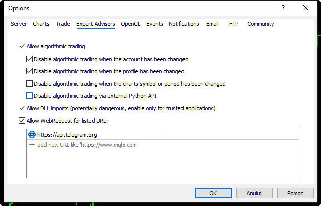 c) Allow algoritmic trading (стосується Expert Advisors та Scripts)