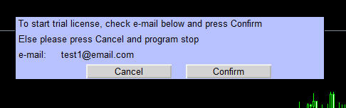 Якщо на цьому комп’ютері в цьому Metatrader вже було здійснено логування і було зазначено поле “Select if you want program remember”, цей панель буде пропущено і відразу з’явиться панель пробної ліцензії, як на зображенні нижче. Якщо це перше логування або при попередньому логуванні не було зазначено поле “Select if you want program remember”, потрібно ввести e-mail та пароль, з якими Споживач був зареєстрований у Базі Даних, і натиснути кнопку “Confirm”. Тоді панель входу зміниться на панель пробної ліцензії.